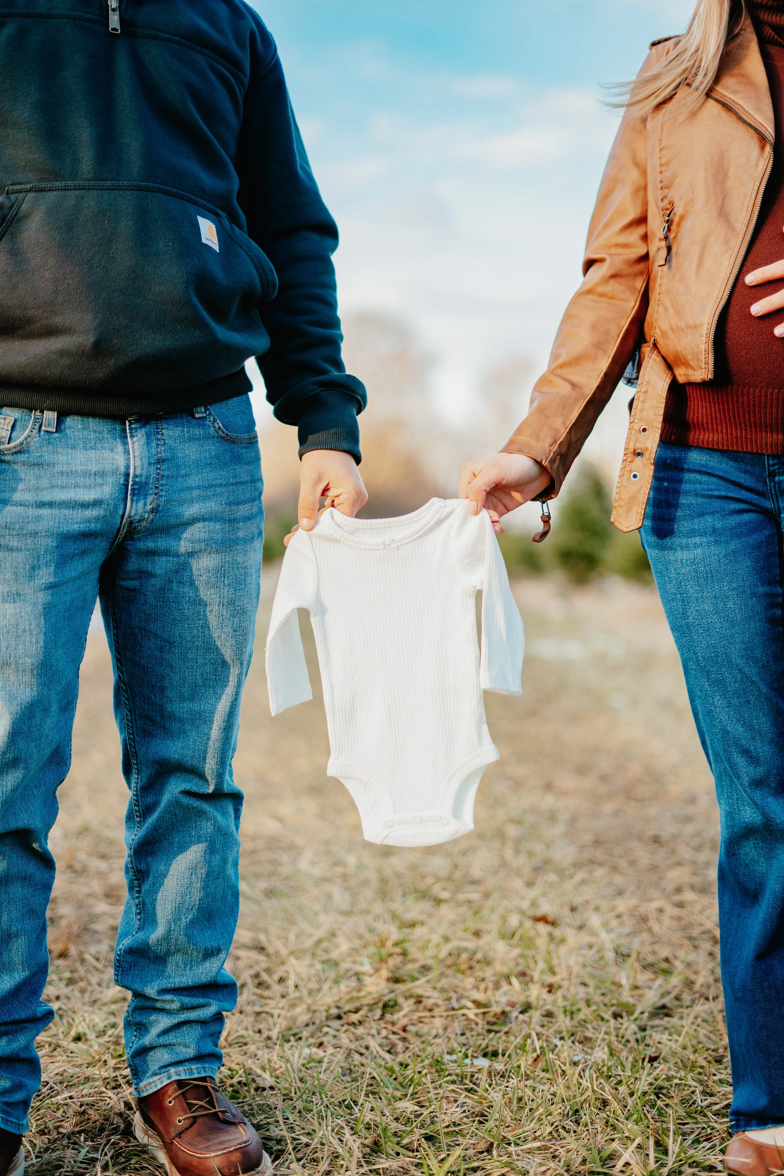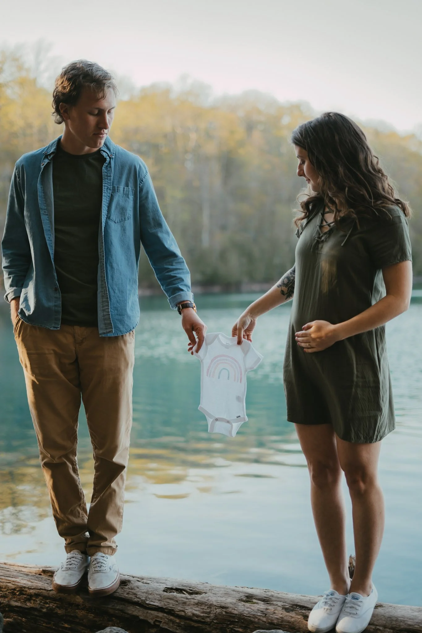 A couple standing on a log by a lake during daytime, holding a small, white onesie with a rainbow design on it.