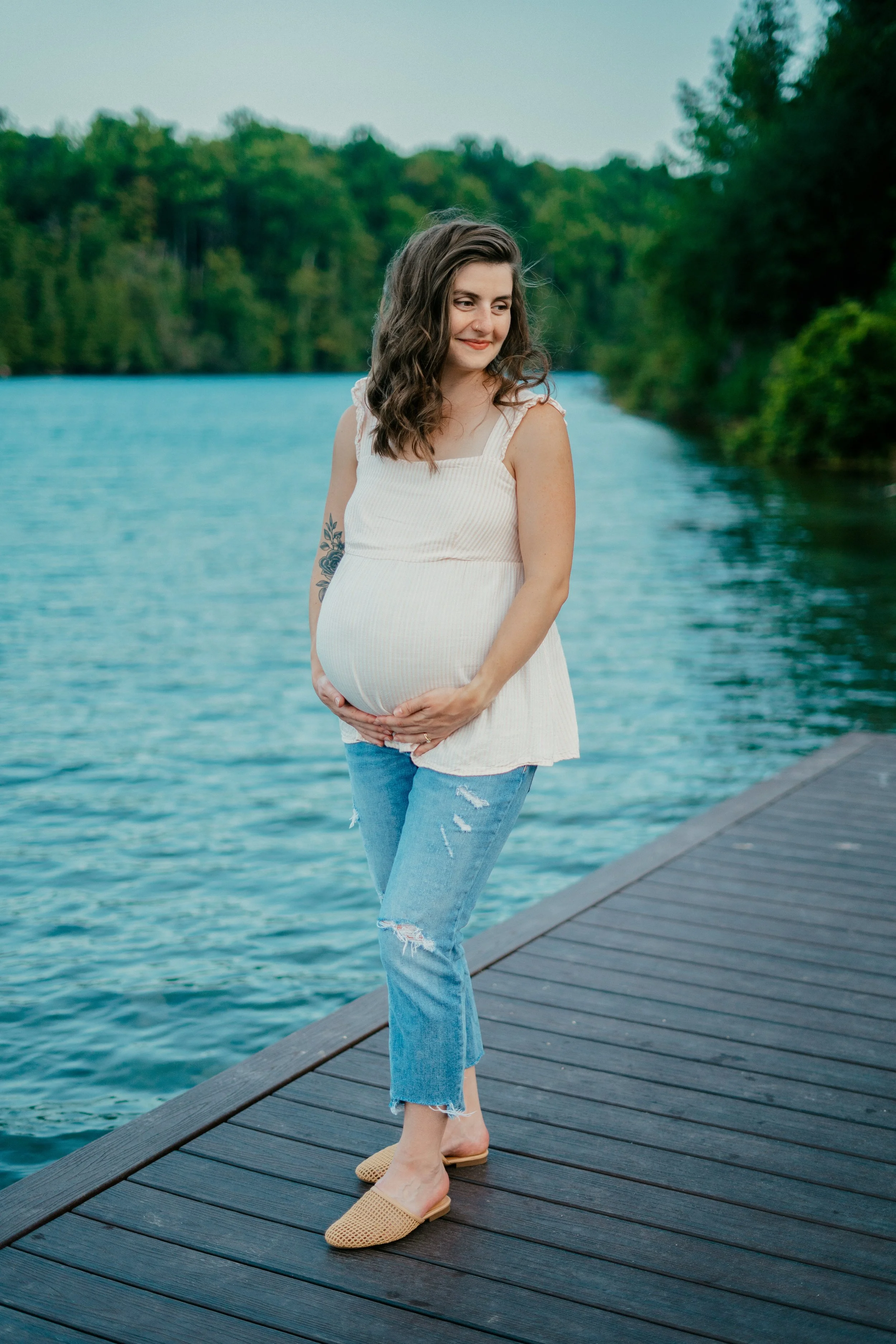 Pregnant woman standing on a dock by a lake, wearing a white top and blue jeans.